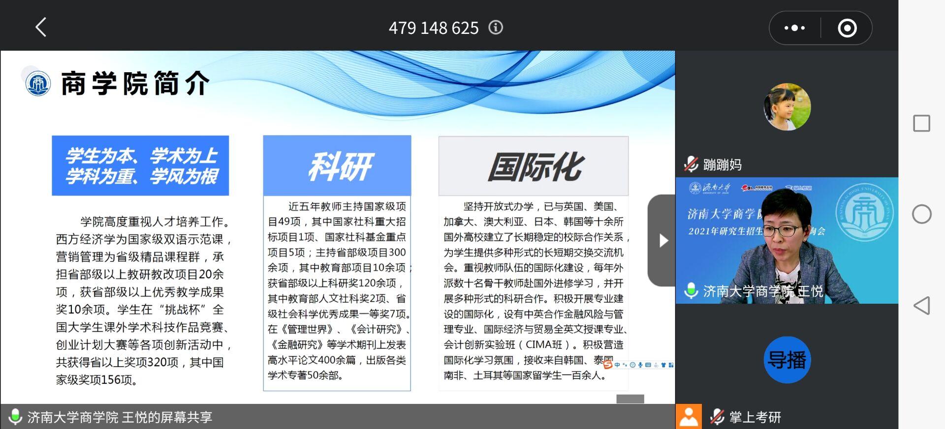 研究生招生和培养的信息,宣讲内容围绕糖心视频概况、学科特色、专业介绍、人才培养、奖助学金体系、就业前景等几个方面展开。在线上互动环节,咨询学生踊跃提问,老师根据同学们的提问耐心答疑,线上交流十分热烈,整个直播过程参与人数两千余人,宣传效果非常好。