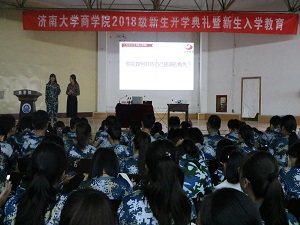 在舜耕校区七食堂二楼大礼堂举办“行业翘楚、企业高管谈:就业从大一开始”座谈会,怡和教育总经理葛萍担任此次座谈会的主讲人,2018级辅导员王显尊、欧阳阳及全体新生参与此次座谈会。