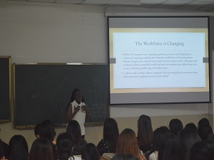 讲座伊始,Sheryl Smith教授以热情的打招呼方式极大地调动了同学们的参与积极性。在讲座中,Sheryl教授向同学们介绍了文化在求职过程中所引发的影响,认为“同样的肢体语言在不同的文化中所表达的意思可能完全相反,工作环境的改变会推动着人们学习多元文化知识。”同时,她认为,为了保持企业的创造性,各个企业也会通过促进员工之间进行相互交流,让其学习对待不同文化的方式。因此,未来各个企业将会把更多的目光放在关注文化的多样性上。Sheryl教授还以互动的形式向同学们介绍了不同国家差异性的打招呼方式,并以自身经历讲述了沟通过程中聆听的重要性。最后,Sheryl教授就在职场中如何与不同的听众进行交流为同学们提出了几点建议,并对同学们提出的相关问题进行了详细的解答。此次讲座在同学们热烈的掌声中圆满结束,并取得了良好的效果。