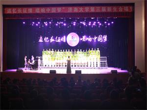 学子将在济大起航。在随后的自选歌曲演唱环节中,合唱队用激昂的歌声演唱歌曲《四渡赤水》,中间穿插着身穿革命战服的演员挥舞红旗的情景,充分展现了中央红军在艰苦环境中坚强革命意志和革命乐观主义精神。合唱队成员凭借嘹亮的歌声,结合钢琴曲调,将歌曲演绎的淋漓尽致,赢得了观众的阵阵掌声。整场比赛气氛热烈,掌声雷动。最终海角社区