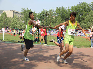 400米栏好手刘强的节奏非常平稳,高大的身材也让他的步幅优势十分明显。接棒的选手蓄势待发等着队友把接力棒传到自己手中,与许亭接棒时,两人配合非常默契,交接棒也比较顺利。由于我院第一棒选手速度较快,进入第二棒男子400米选手于志磊将领先优势越拉越大,观众们的一阵阵欢呼,接力选手越发振奋,风一般的速度也赢得了同学们的信任,凭借着必胜的信念,坚定的眼神冲到了终点。