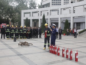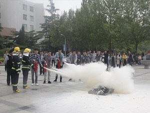 演习时间一到,工作人员便在预定位置燃放烟雾弹,同学们有序地从宿舍撤离,撤离期间,工作人员认真维持秩序,指引逃生路线,逃生演练现场紧张有序。待所有人到经管楼前广场集合完毕后,校安全管理处处长丁立波发表讲话,主要从宿舍火灾的预防问题进行阐述,他讲到,宿舍火灾不容小觑,同学们要提高消防安全警惕意识,平时注意检查电器使用情况,消除安全隐患。随后,校安全管理处科长张韶春向大家详细介绍了灭火器的使用,用“一拉二提三对四扫”简洁概括了使用步骤并亲自进行演示,同时向师生们反复强调其中的动作细节。紧接着,消防人员在现场演示了消防车及灭火器的使用,并在现场点燃火堆,让大家亲身体验灭火器灭火。待火堆燃起,老师们先去做了示范,随后同学们积极踊跃上前体验。由于灭火器数量有限,工作人员打开了电子仿真灭火仪器供大家体验,再次提醒大家牢记消防演练的重要性。最后,由专业人员持工具进行彻底灭火,本次活动圆满结束。