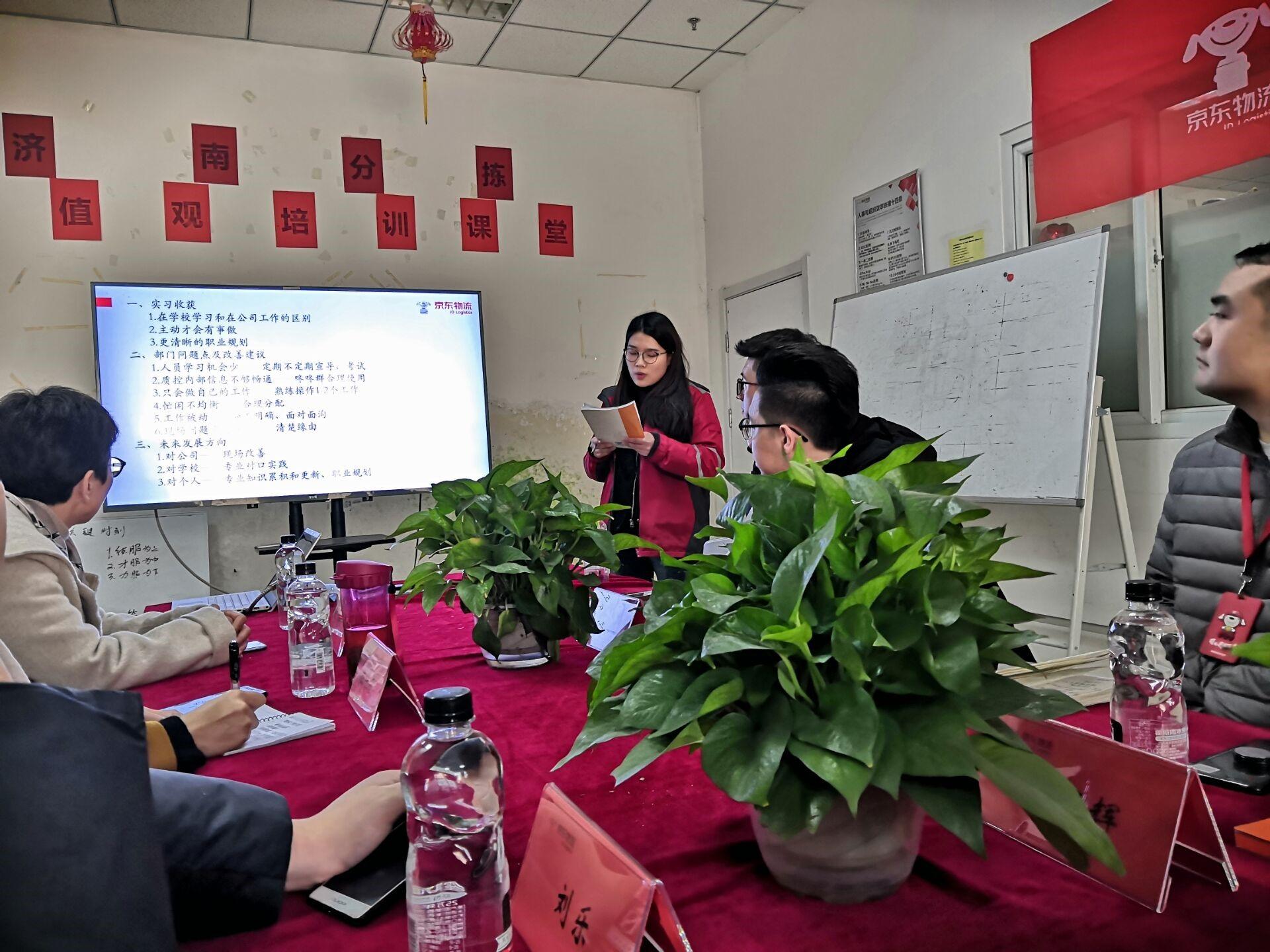 物流工程与京东物流山东省会专业实践汇报会”。京东物流隋臻总经理、人事部邢崇智经理、相关部门负责人以及八位实习的研究生同学参加了会议。