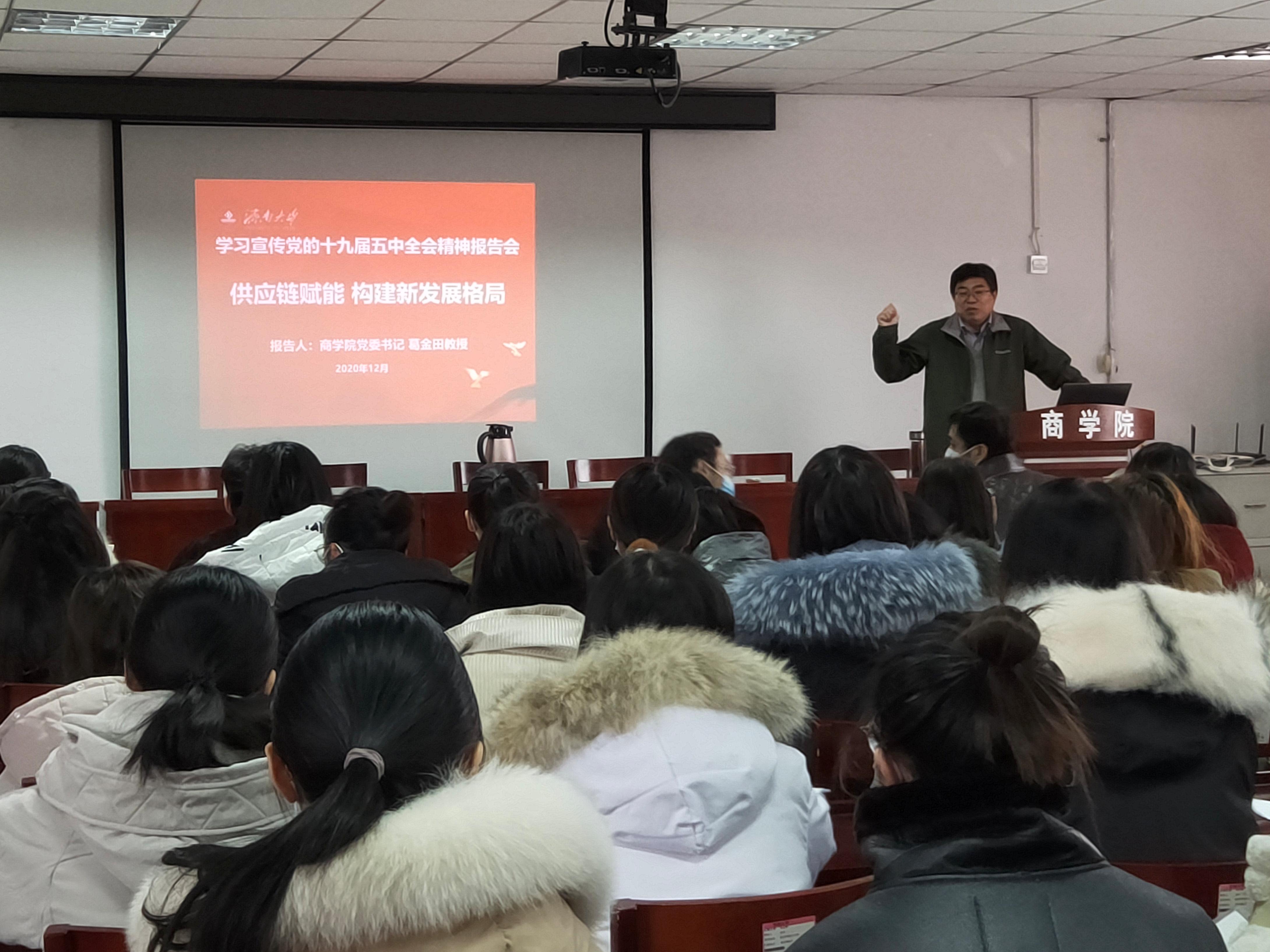 葛金田书记以“凝心聚力再出发,砥砺奋进新征程”为主题,围绕四个把握,即把握党的十九届五中全会精神内涵、把握中国经济社会发展面临的新环境、把握科学分析互联网时代经济发展新特征,以及把握供应链赋能加快构建双循环新发展格局四个关键点展开宣讲。葛书记指出,在百年未有之大变局、百年未有之大疫情、百年奋斗目标等三大背景下,数字化、大国博弈、治理重构等进一步推动社会加速变革,世界经济格局将深刻调整。他强调,在党的十九届五中全会精神的指导下,我们要结合糖心视频实际展开工作,认真做好理论阐释和学习培训,同时,时刻保持对国内外经济形势的敏感度,准确把握国内外经济新形势,正确认识互联网时代中国经济发展新特征,进一步把握好理论研究和学习的正确方向。要求同学们要加强党的十九届五中全会精神学习,做到学深悟透,要以多途径、全覆盖、深内涵的工作思路开展学习研讨活动,经常性地谈心得、讲体会、学落实;要求同学们要统筹兼顾,把学习贯彻全会精神与各自专业相融合,服务社会经济建设,为国家多做贡献。
