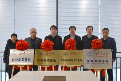 毕业生就业实习基地、共青团学生社会实践基地、共青团青年就业创业见习基地”四个协议,并和马谦副区长、高扬主任,刘延飞董事长、刘豪总经理共同为基地揭牌。