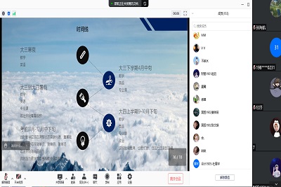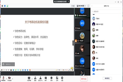 此次会议在线上进行,会议开始前,主持人阐明当今社会竞争激烈,考研成为越来越多大学生的选择的现状,同时介绍了四位取得优异成绩的毕业生,会议正式开始。会议期间,来自不同名校的研究生向学生就高数,英语,管理综合,政治等学科分享自己宝贵的学习经验:高数复习上,要多做题,勤总结;英语复习上,重在平时的单词积累,考题训练;专业复习上,要根据大纲制定适合自己的计划,成功保研的毕业生在保研信息,学生自身素质等方面的细节向同学们讲述自己的经历。他们共同强调,考研不要好高骛远,要根据自己的情况量力而行,考上适合自己的学校,同时也要注意休息和锻炼,身体是革命的本钱。