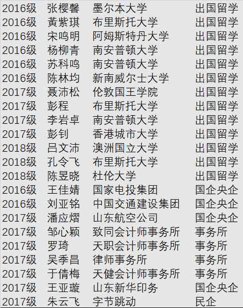 本科生一次就业率在90%以上,主要去向是农行、招商、浦发等金融机构,中国重汽、鲁能集团、蒙牛集团等知名企业和信永中和、瑞华、立信等会计师事务所。近15%的优秀毕业生考取厦门大学、中国人民大学、山东大学、中国海洋大学、东北财经大学、天津财经大学等知名高校的研究生。近10%的毕业生考取财政、税务、人社等部门或系统的公务员。近5%学生到加州大学、纽约大学等国外大学留学。为提高学生“两创”能力,实施“一生一赛”措施,鼓励大学生参加各类大赛,近三年获得省级以上科技创新竞赛奖80余项,其中CIMA全球商业精英挑战赛(GBC)华东区域决赛冠军,全国“挑战杯”创业计划大赛铜奖1项、全国大学生会计信息化技能大赛全国一等奖2项。