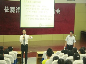 报告会伊始,佐藤先生向在坐的同学们提出三个问题:人类是谁?从何而来?将去何处?要想得到这三个问题的答案,我们需要解开人类的基本命题,就是“何谓自己,何谓人类,何谓生命,何谓实体”。这些人类的基本命题是地球上73亿人共同的、普遍的根源性课题,它跨越不同的民族、国籍、宗教和职业。在解决“何谓自己”这个问题时,佐藤先生引用德尔斐神殿的箴言“汝当自知(认识你自己)”和勒内•笛卡尔的名言“我思故我在”,来加深同学们对“何谓自己”的认识。在讲座过程中,佐藤先生与同学们展开有趣的互动,同学们也积极地回答佐藤先生的问题。最后,佐藤先生告诫同学们要始终坚持对这四大命题的探求,必须始终坚持对走出这三堵墙,即自己自我、企业团体和国家民族,尤其是自我的希望。