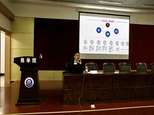 会上,姜舟经理结合自身工作经验,运用通俗的语言,与同学们就广发银行的发展历程、商业银行的未来发展大势和如何走进商业银行进行积极的交流。为了使同学们进一步地了解商业银行的运营模式,姜舟经理以广发银行为例,详细介绍了银行的公司治理、组织架构及贷款产品体系,并就公司金融、零售金融和金融市场等专业名词展开具体阐述。同时姜经理从国有银行改革、民营银行发展以及网上银行崛起三方面分析了银行行业的未来发展,他指出在大数据时代之下,商业银行机遇与挑战并存,实体银行必须积极依靠国家战略,向综合金融集团方向发展。