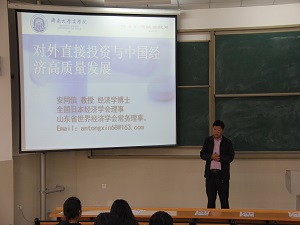 于阶梯教室举办“对外直接投资与中国经济高质量发展”主题报告会。经济学博士,全国日本经济学会理事,山东省世界经济学会常务理事安同信教授受邀作为本次主题报告会主讲人。海角社区