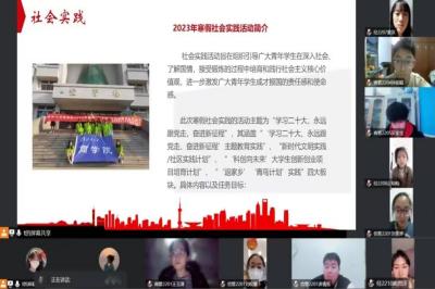 社会实践的优秀成果,分享了自己参与社会实践活动的经历与感受并号召大家积极参与本次社会实践,在为人民服务中贡献青春力量,领会党的二十大精神;最后,实践部负责人高惠娟同学针对志愿者们提出的问题进行了现场解答,并提醒志愿者们认真做好行程活动安排工作和社会实践 总结工作。至此,2023年寒假社会实践活动线上启动仪式圆满结束。