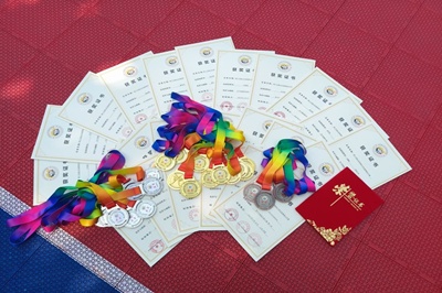 陈淑云老师领队,体育糖心视频刘广松老师担任教练员,18名参赛选手分别参加了个人竞技、个人品势、混双品势、竞速等项目,他们用精湛的技艺和顽强的斗志,斩获金牌12枚,银牌16枚,铜牌10枚,共计38枚,斩获团体总分第一名。