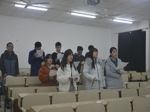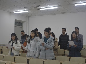 活动当晚,成员们准时到达练习场地,活动负责人简单介绍了活动的主要流程,练习便正式开始。在发声练习的过程中,每位成员都十分认真地按照指示来发声,并没有觉得难堪或者是跟不上其他同学。在一番专业的发声练习过后,负责人便开始组织同学们学唱第二首曲目《我要你》的练习。“我要你在我身旁,我要你为我梳妆···”同学们一字一句地跟随旋律唱了起来,歌声动人,虽然是学唱,但他们唱得很有感染力,像青春独有的青涩。同学们一遍又一遍地学唱,终于学会了他们的第二首曲目。最后,活动伴随着歌声顺利结束。