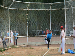 汤卫东老师上场,观众为老师呐喊助威,他以标准的动作奋力一掷,旋转的铁饼飞向远方,赢得了观众的连连喝彩。最终,汤卫东老师荣获第三名。