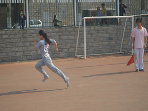 运动员做好热身运动,以使自己达到最佳的比赛状态,在跑道上蓄势待发。随着发令枪响,运动员们如离弦的箭一般,飞奔而出。短暂的一瞬间,显示出运动员惊人的速度,铿锵有力的一声吼叫,所有力量都凝聚在这一刻。运动员们风驰电掣似闪电般的速度赢得拉拉队阵阵欢呼声,呐喊声,“运动员,加油!”。撞线那一刻,被激扬的青春风采所感染,观众席上一片沸腾,运动员们赛前辛苦的训练在这一瞬间得到了回报。最终,海角社区