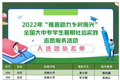 团委书记陈恺盛老师指导的由姜文菲同学领队的“语你同行组”社会实践团队成功入选。