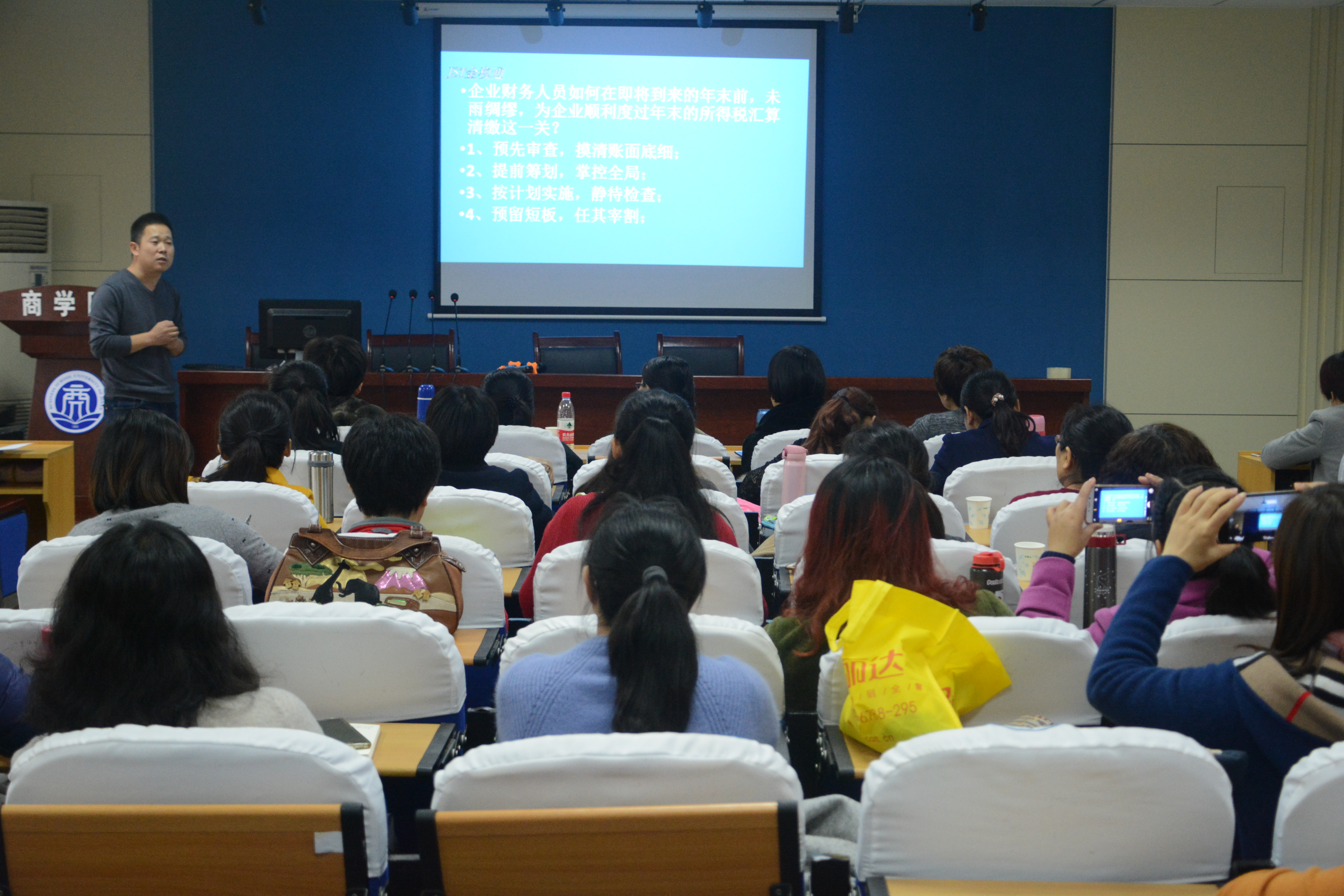 此次课程的主题为“年末将至,企业财务人员应该做好哪几方面的工作”。在讲堂上,张钦光老师围绕企业财务人员如何在即将到来的年末前,未雨绸缪,为企业顺利度过年末的所得汇率清缴这一关展开课程。其中张钦光老师总结了预先审查,摸清账面底细;提前筹划,掌控全局;按计划实施,静待检查;预留短板,任其宰割四个重点,并就这四点展开,理论与例题相结合,进行了详细的讲解。当有部分同行不理解的时候,张老师会对其进行更仔细地解释,时而在白板上边写边讲,时而与大家就某些问题进行讨论,课堂上学习氛围浓厚。