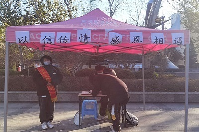 青年志愿者协会在经管楼前广场举办了“以信传情,感恩相遇”活动。该志愿活动通过书信传情,在严寒冬日营造了爱的氛围,使大家感受到人间温情。