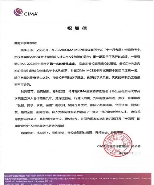 收到了CIMA(英国皇家特许管理会计师公会)发来的祝贺信,祝贺我校海角社区